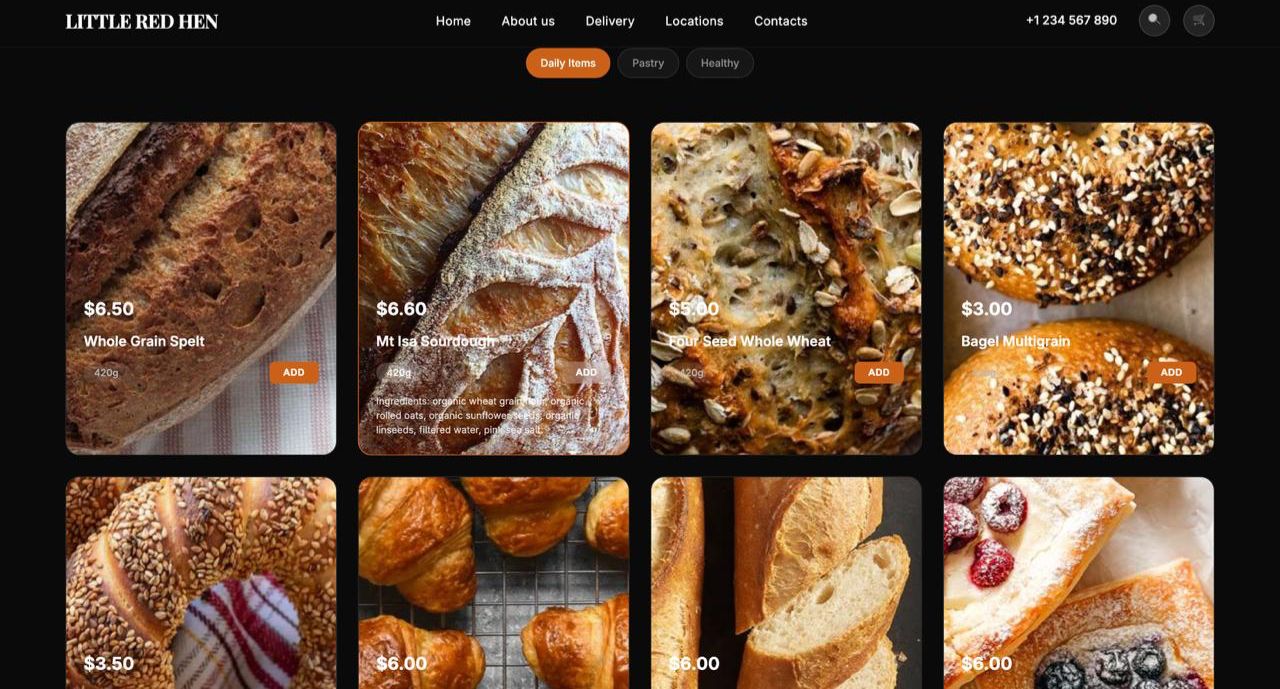 A visually appealing bakery website with menu highlights, online ordering, and smooth React.js UI using modern Tailwind design.
